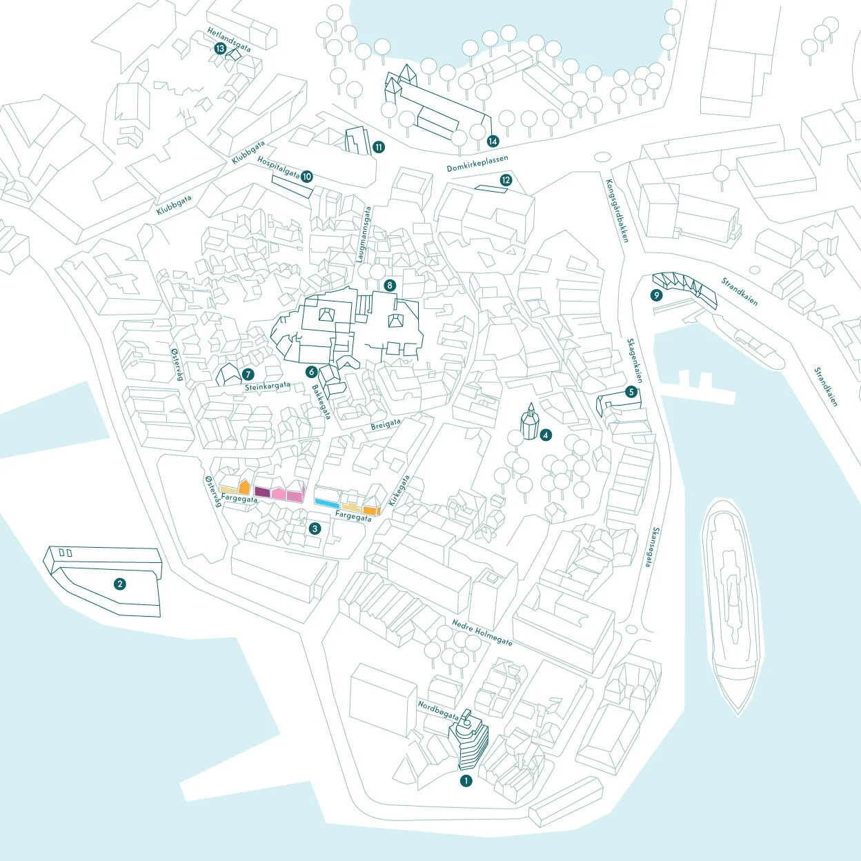 Illustrasjon og grafisk design. Kartet er ei visuell framstilling av bykjernen i Stavanger med bla. nokre utvalgte restaurantar.